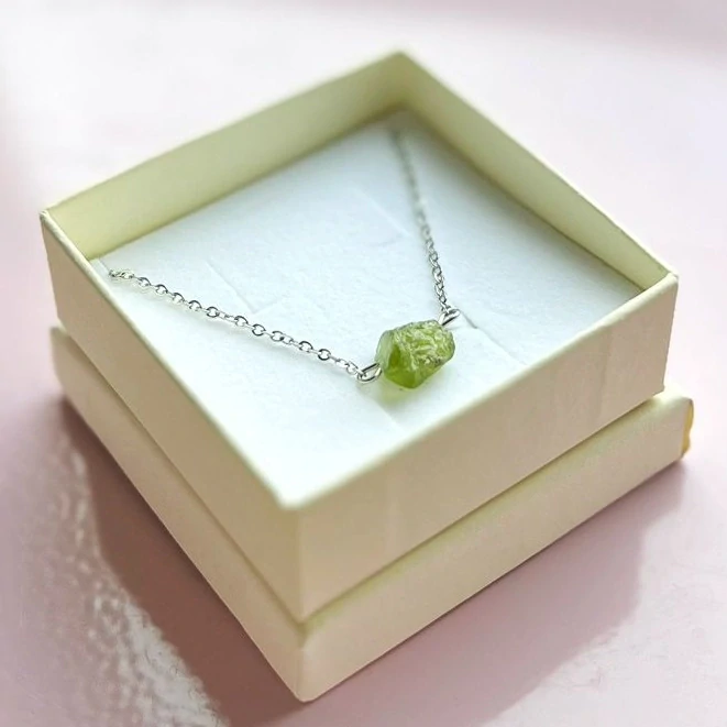 Náhrdelník ze surového olivínu na řetízku z nerezové oceli. Součástí balení je dárková krabička.