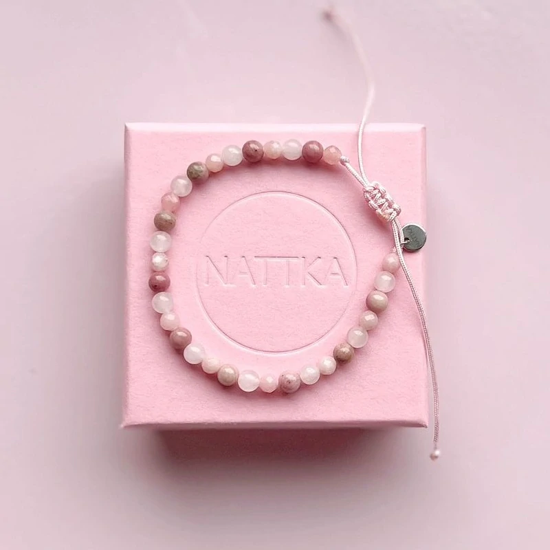Náramek je dodáván v dárkové krabičce, zdobí ho růženín, jadeit a rodochrozit.