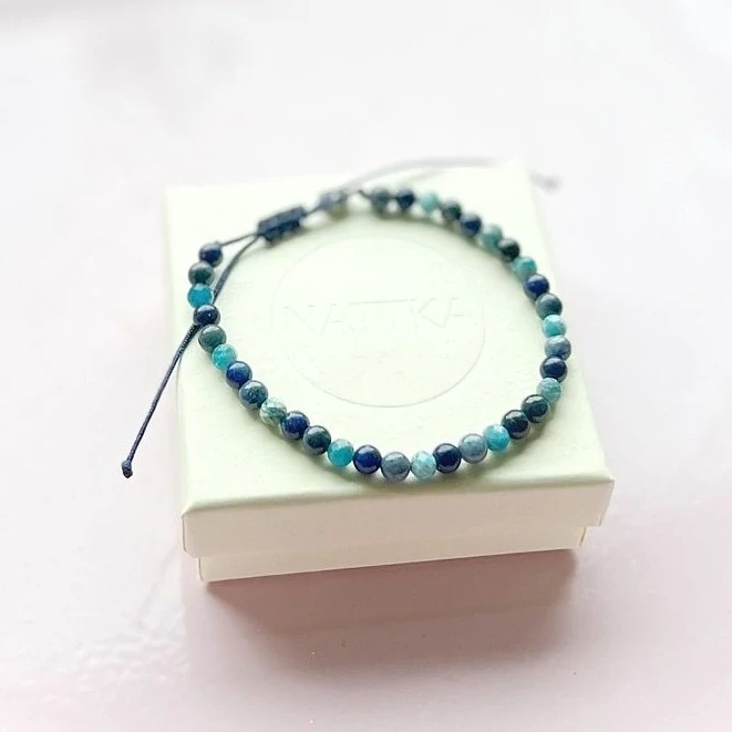 Náramek je dodáván v dárkové krabičce, zdobí ho lapis lazuli, dumortierit a apatit .