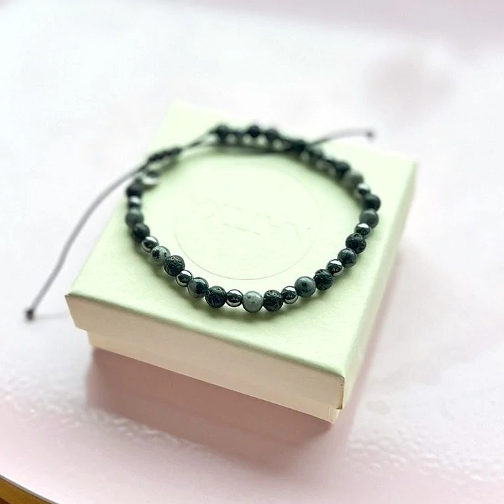 Náramek je dodáván v dárkové krabičce, zdobí ho labradorit, hematit a lávový kámen.